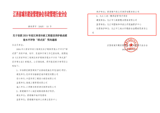 在2024年度江西省市政工程建設養護最高質量水平評價“樣式雷”獎獲獎名單中,九江智慧水管家公司與九江三峽水環境公司聯合申報的“九江三峽一期項目管網子項目”成功入選,成為九江市唯一獲此殊榮的市政管網類項目。作為江西省市政工程建設和管護領域的最高榮譽,“樣式雷”獎歷經項目申報、資格審查、現場初評、專家復查及社會公示等多輪嚴格篩選,最終從全省百余個參評項目中遴選出入圍項目,其評審結果代表了當前江西省市政行業的最高質量水平與技術創新方向。