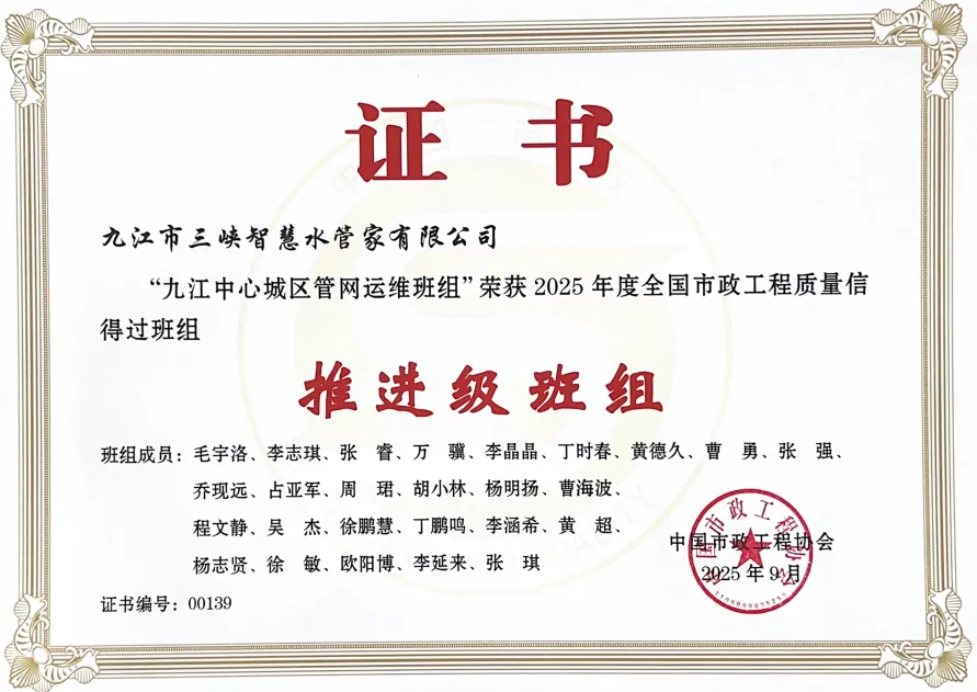 在江西省城市建設管理協會組織的評比中,九江智慧水管家公司共斬獲五項QC成果一等獎、兩項二等獎。其中“九江中心城區管網運維班組”被授予江西省城市建設管理協會“推進級班組”稱號。經省協會推薦,五項QC成果最終榮獲中國市政工程協會三類成果,“九江中心城區管網運維班組”再次獲得中國市政工程協會“推進級班組”認定,實現榮譽雙豐收。